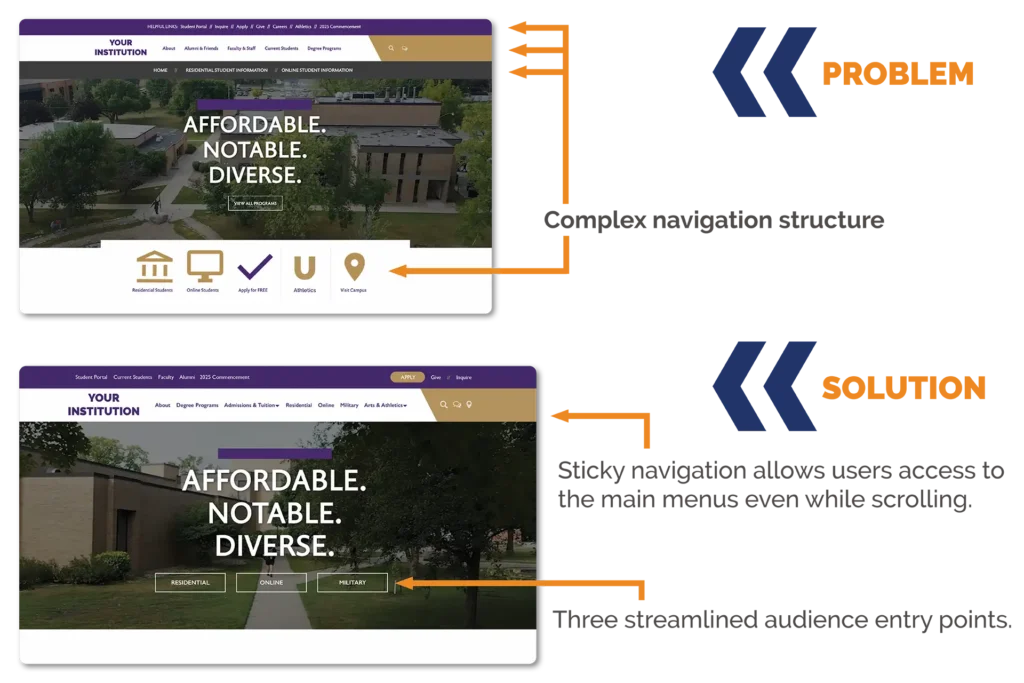 Many institutions lack a clear, compelling, and consistent message across digital channels. This fragmentation confuses prospective students and weakens trust — particularly for online adult learners who expect transparency, quality, and relevance. A unified brand strategy is essential to differentiate in a saturated market.